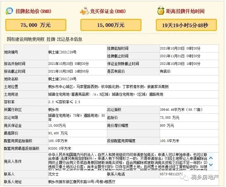 3.该地块实施限价出让,最高限价93400万元;达到最高限价后有2个或2个以上竞拍者的,转入竞拍地块内配建公寓建筑面积,公寓起始竞拍建筑面积100平方米,竞拍以100平方米建筑面积为一个增幅;所配建的公寓(含全部配套设施)须无偿移交至桐乡市城区开发管理委员会或其指定的国有公司。