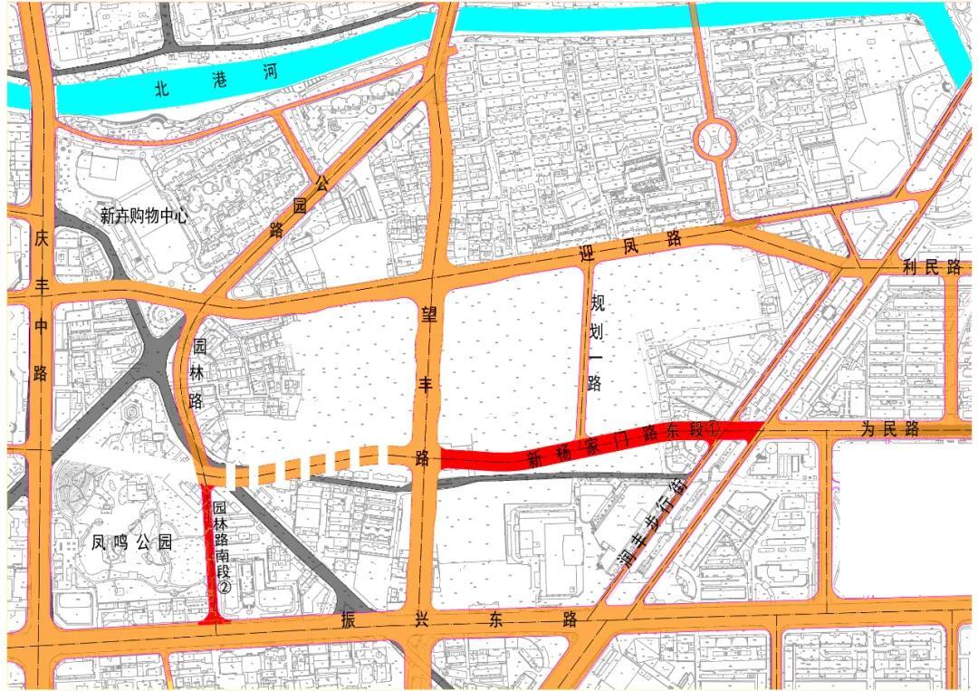 园林路重建分南北两段实施,本次通车路段为园林路南段。该段南起振兴路,北至新杨家门路,道路长约为217.6米,宽为14米,双向两车道。重建后的园林路与振兴路形成垂直路网,实现南北直通。