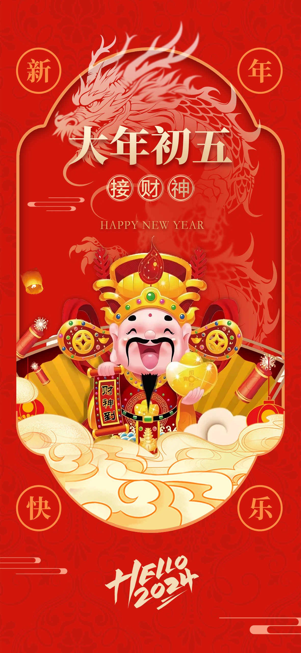 龙年初五财神到,金元宝满屋飘,愿您事业八面玲珑,爱情七彩纷呈,财运六六大顺,生活五味俱全,健康四季平安,快乐三阳开泰,幸福二龙腾飞,好运一马当先!