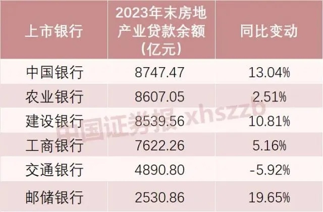 具体到各家银行,截至2023年末,中国银行的房地产业贷款余额最高,为8747.47亿元,农业银行、建设银行紧随其后,均超过8500亿元,工商银行、交通银行、邮储银行的房地产业贷款余额分别为7622.26亿元、4890.80亿元、2530.86亿元。和2022年末相比,交通银行的房地产业贷款余额下降307.77亿元,同比下降5.92%,邮储银行、中国银行、建设银行均实现双位数增长。