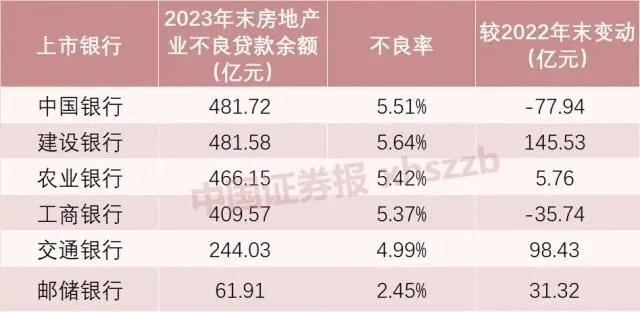 工商银行副行长王景武在2023年业绩发布会上表示,该行坚持管好存量、精准化险,加大风险房企和项目的处置出清力度,确保资产质量稳定可控,2023年末,该行境内房地产业不良率较年初下降0.77个百分点。