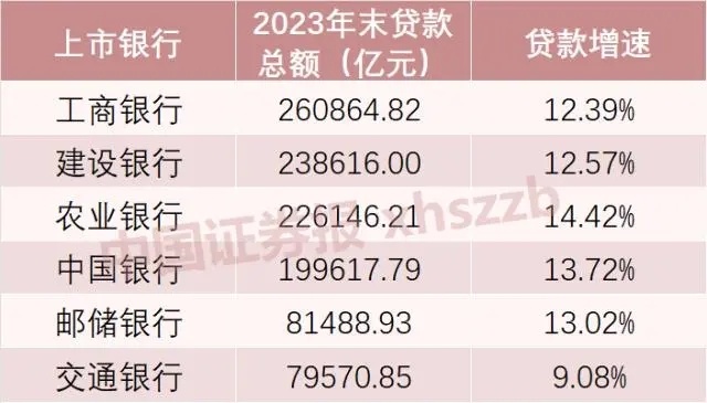 从贷款总额来看,2023年末,国有六大行贷款总额合计约108.63万亿元,较上年增长12.89%。六家银行中,除交通银行之外,其余五家银行的贷款总额均实现双位数增长。