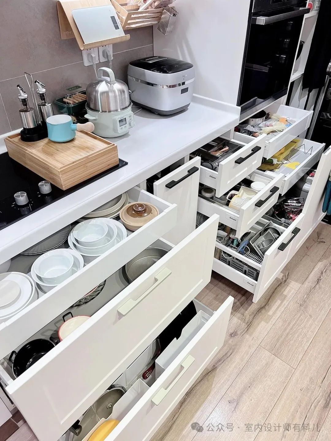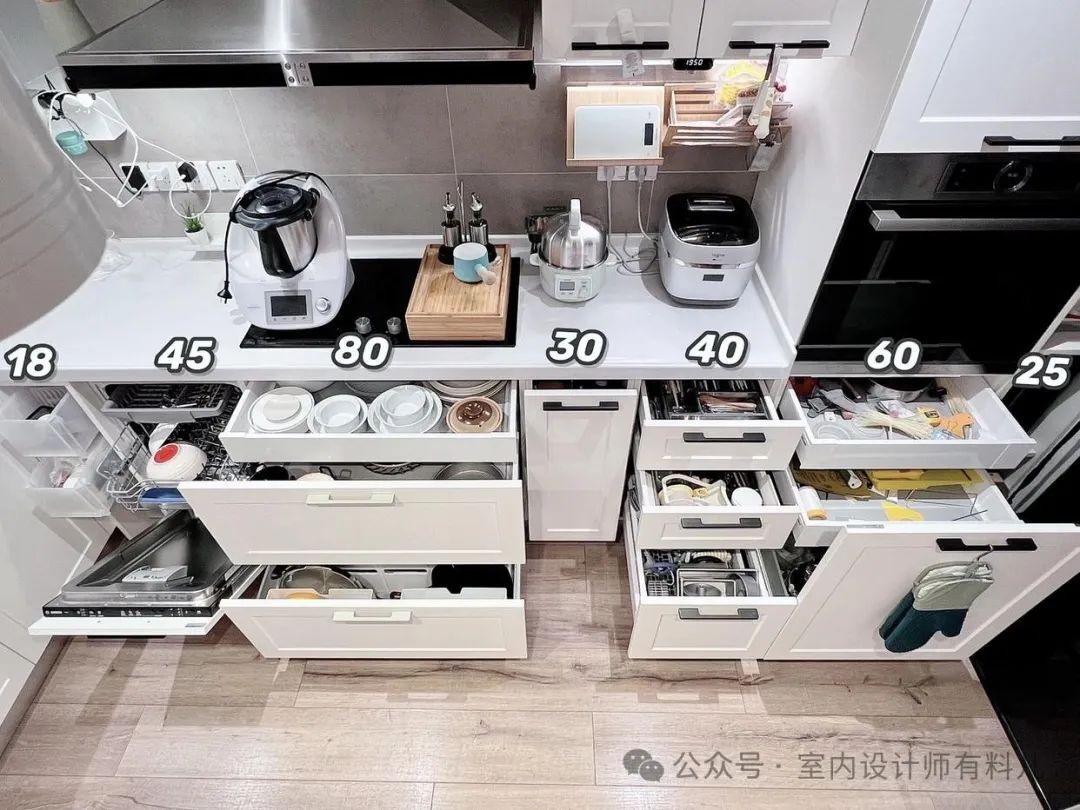 比如这家屋主入住没多久就将碗篮改成了三层抽屉,烤箱下面的平开门也改成了三层抽屉,大抽屉可以自己买一些分隔板,每个分区都能得到合理的利用,收纳满满。