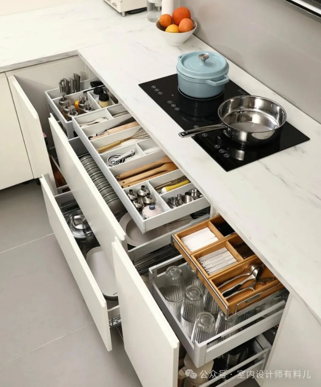 而薄抽就放刀叉碗盘,高抽放锅和高瓶子,里面做好分隔,打开抽屉的时候一目了然,也不会叮铃哐咣地响。
