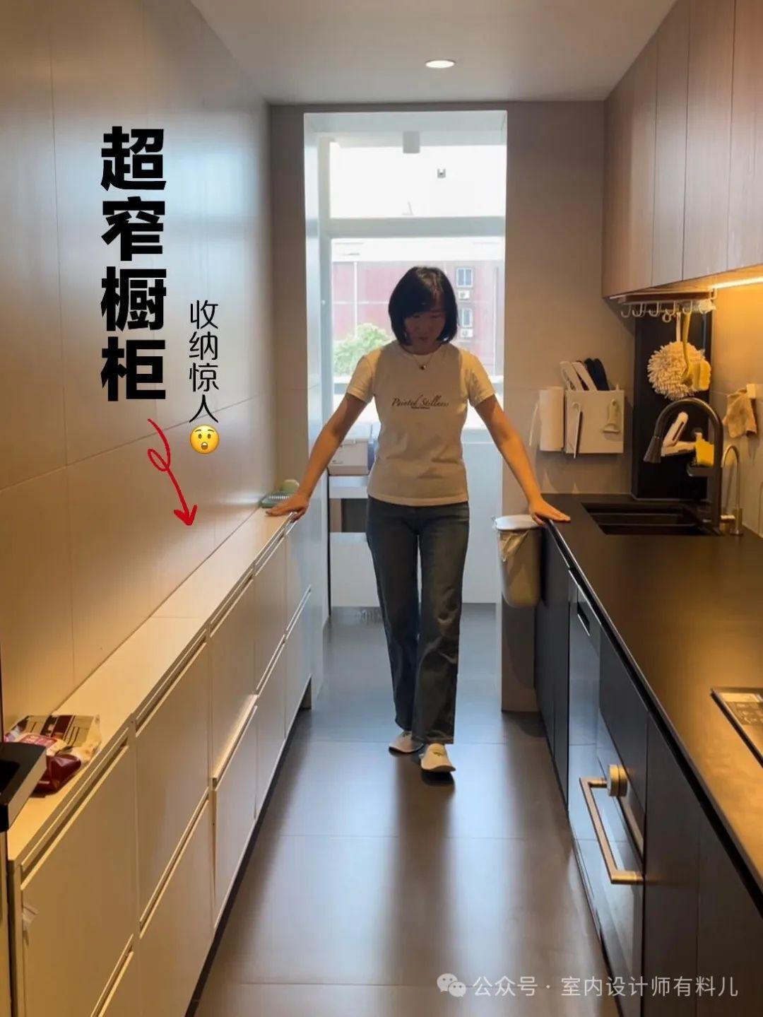 L型或一字形厨房宽度有限,一边做完橱柜后过道就很窄了,其实可以在另一侧靠墙安装窄柜。