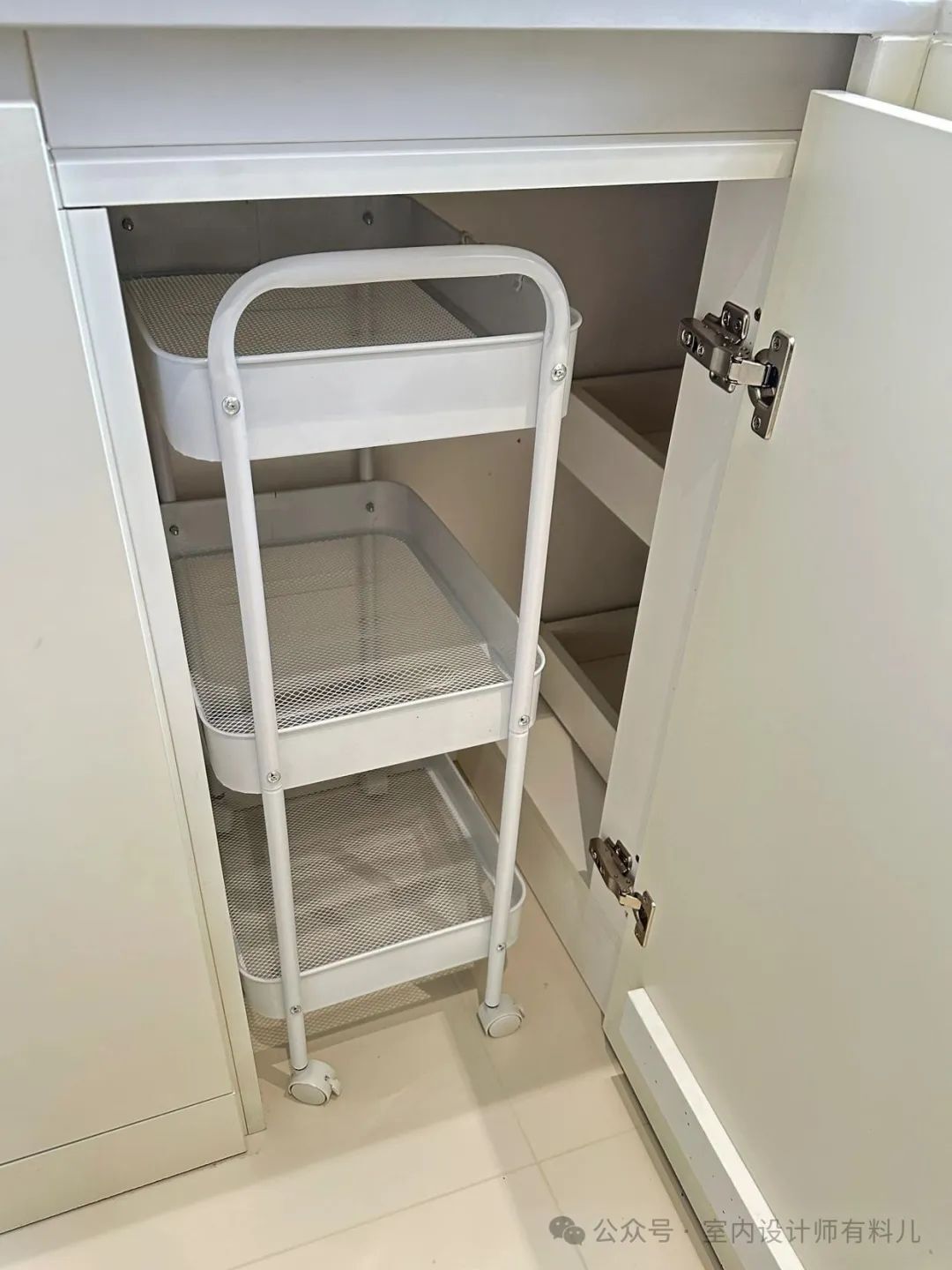 小推车平时拿取东西非常方便,推进去也不占地方,转角里侧还能放一些厨房的锅具或囤货,可以定制成抽拉板,用完后直接推回去。