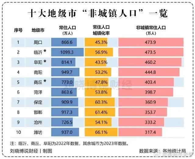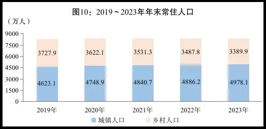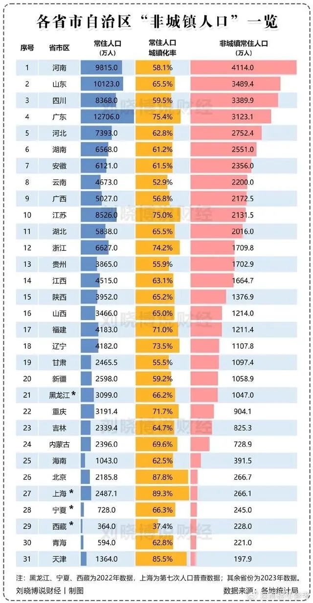 河南2023年末全省常住人口9815万人,常住人口城镇化率为58.1%,其中城镇常住人口5701万人,乡村常住人口4114万人,非城镇化人口位居全国各省第一。