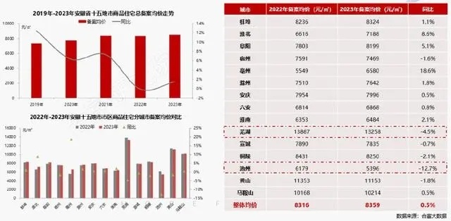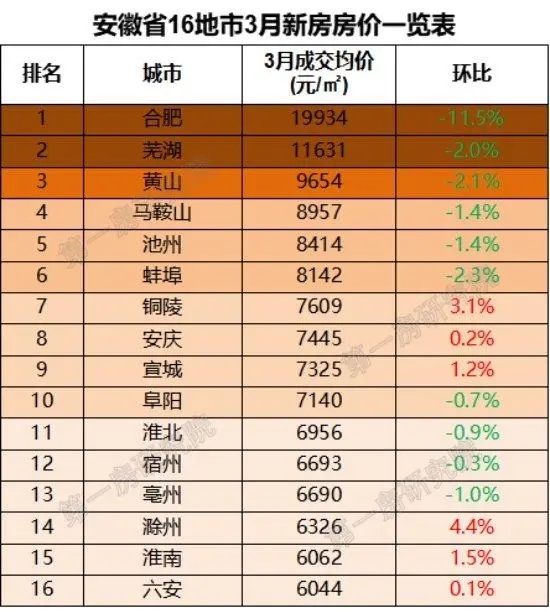 安徽楼市分化走向明显,省会合肥改善性需求释放,产品套均面积扩大,市区新房供应均价突破2.3万元/㎡;地市持续“以价换量”,皖南价格跌幅明显,整体价格走势相对平稳。