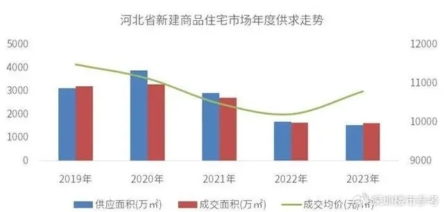 2023全年河北省新建商品住宅新增供应面积1534万㎡,同比下降9.0%;成交面积1625万㎡,同比下降0.6%,成交均价为10796元/㎡,同比上涨5.8%。