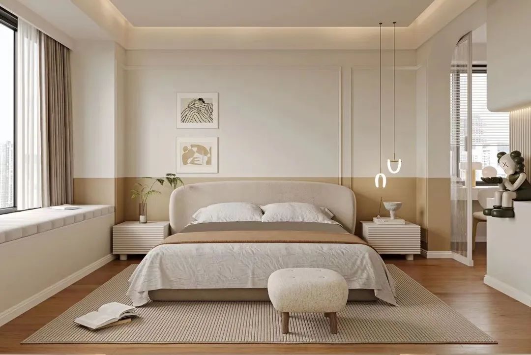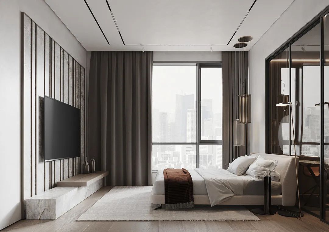 设计建议:将卧室空调安装床尾侧方的墙面上,这样空调风会从侧面或者通过室内立面的反弹转吹到床上,整体的风力比较舒适柔和。