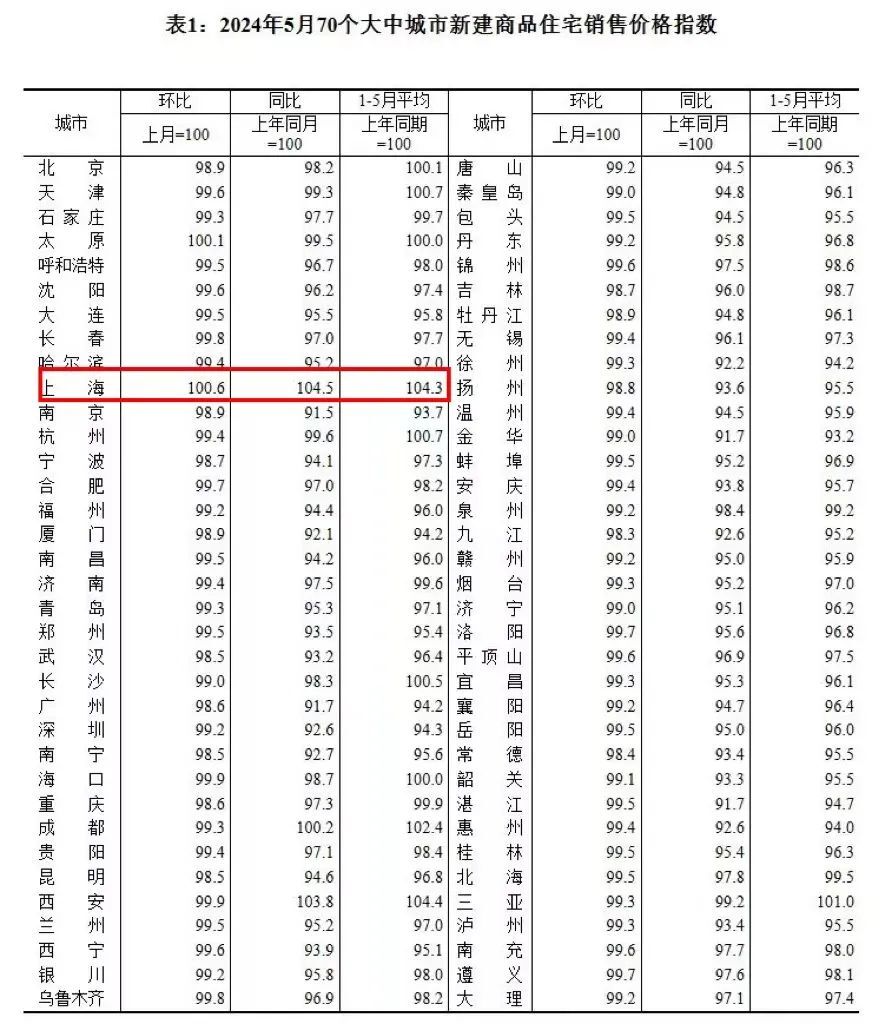 6月17日,国家统计局公布2024年5月份70个大中城市商品住宅销售价格变动情况。从新房市场来看,只有上海、太原两个城市新房价格环比上涨,涨幅分别为0.6%和0.1%。同比来看,5月份上海新房价格涨幅高达4.5%。