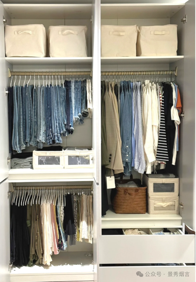 我原本打算将衣柜的80%空间都用于挂衣服,觉得这样拿取和存放都会很方便。现实却给了我一个“大嘴巴子”,这种设计并没有如我所愿地妥善保存衣物,反而让很多衣服都“无家可归”。