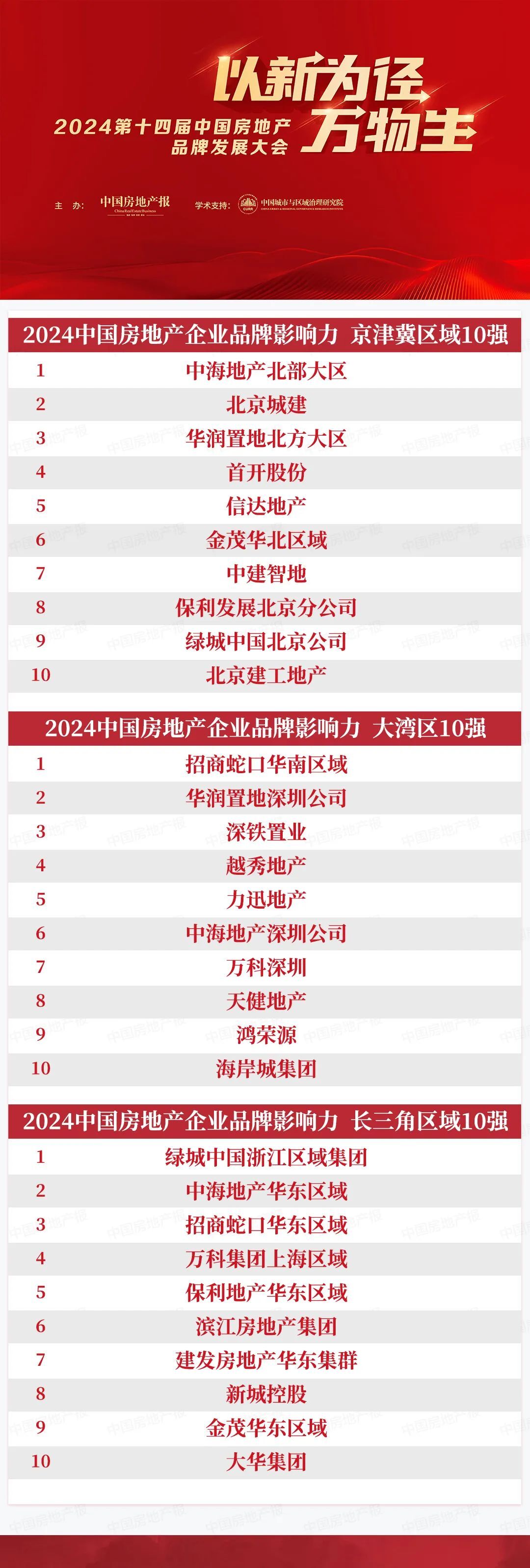 7月10日,由中国房地产报、中国城市与区域治理研究院联合主办的“以新为径 万物生——2024第十四届中国房地产品牌发展大会”在北京全国人大会议中心举行。会上,重磅揭晓了备受业内关注的“2024中国房地产企业品牌影响力京津冀区域10强”“2024中国房地产企业品牌影响力大湾区10强”“2024中国房地产企业品牌影响力长三角区域10强”“2024中国房地产企业品牌影响力西安区域10强”等榜单。