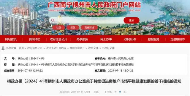 7月15日,南宁横州市发布《横政办函〔2024〕41号横州市人民政府办公室关于持续促进房地产市场平稳健康发展的若干措施的通知》。