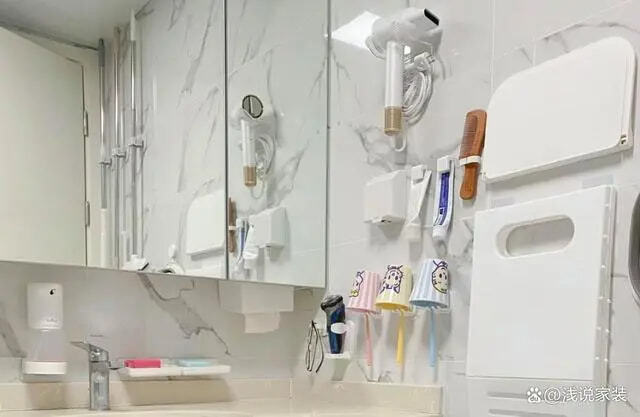 常用的牙膏、肥皂、纸巾等尽量不放在台面上,可以在台盆区和镜柜之间的墙面进行垂直收纳,释放台面空间,减少细菌滋生。