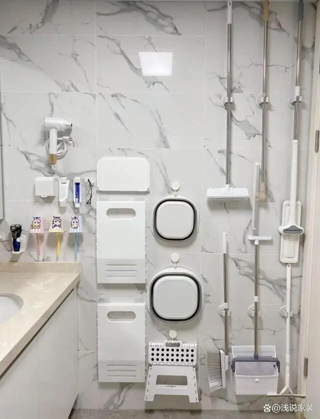 卫生间需要使用的各种工具,如刮水板、脸盆、湿区拖鞋、拖把、刷子等,如果都放在台面或地上,不仅占用空间,还难以干燥,容易滋生细菌,清洁时还需来回挪动,相当麻烦。