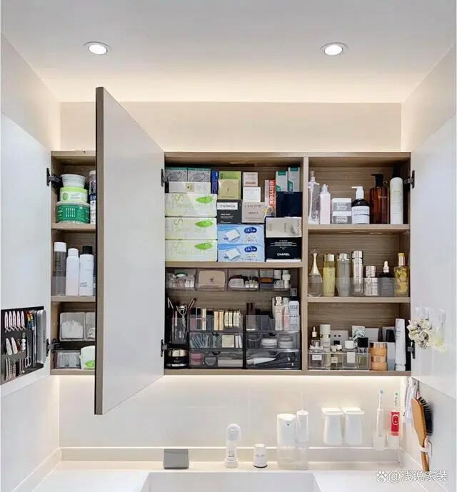 大约10cm厚的镜柜,不占太多空间,却可以将所有小物品平整地收纳,非常适合存放卫生间的小物件,整齐而便于取用。