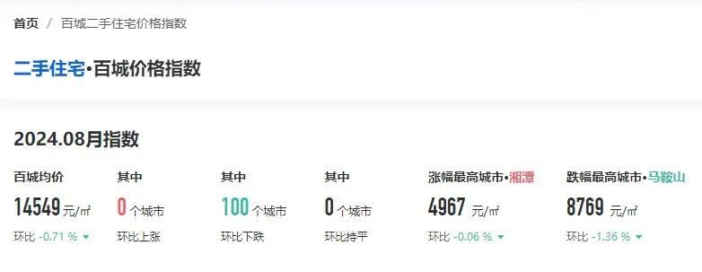 二手住宅:平均价格为每平方米14549元,环比下跌0.71%,跌幅较7月收窄0.03%。