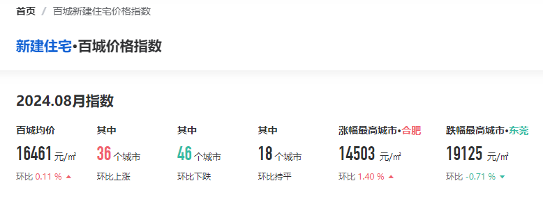新建住宅:平均价格为每平方米16461元,环比上涨0.11%,同比上涨1.76%;受部分城市优质改善项目入市的带动,百城新建住宅价格环比结构性上涨。