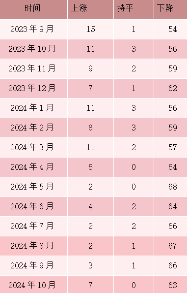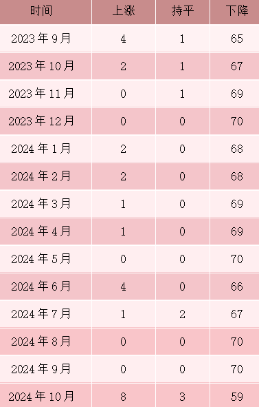 国家统计局11月15日发布数据显示,2024年10月份,70个大中城市中,各线城市商品住宅销售价格环比降幅收窄或转涨、同比降幅趋稳,房地产市场预期进一步改善。