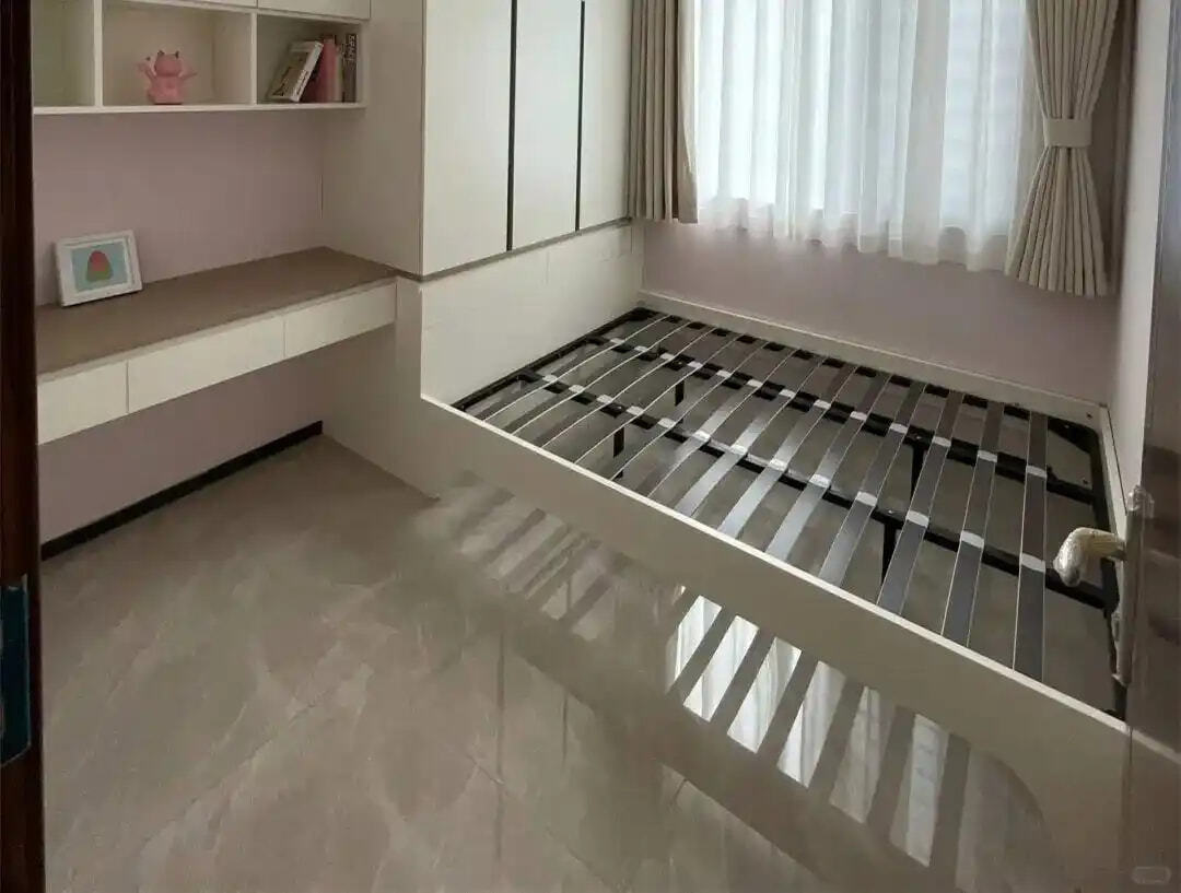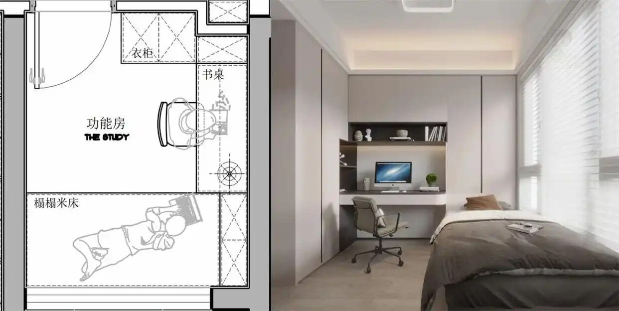 但榻榻米床不透气、容易发霉,设计姐建议大家选透气性好、节省空间的成品床架,再配上定制书桌+定制柜,这样做书房,会让书房具备变身长期卧室的可能性。