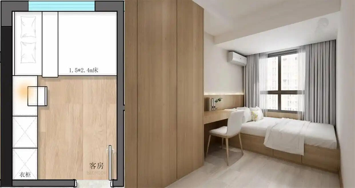 ②衣柜+书桌+床L字型布局,把床设在最里侧,衣柜与书桌平着靠墙,适合狭长的书房。