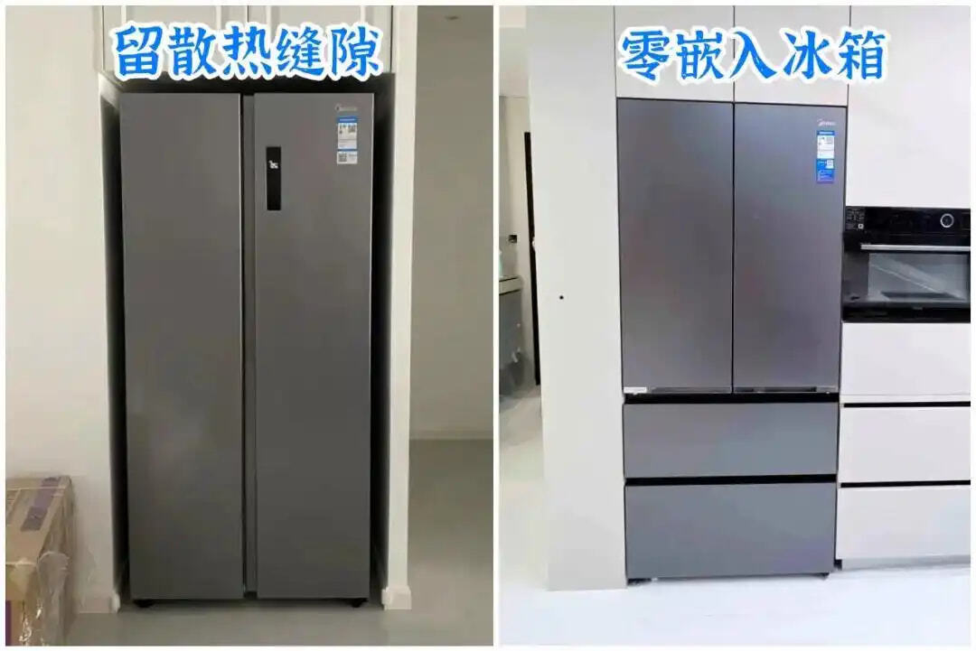 比如普通冰箱嵌入安装,要在侧边与顶部预留5cm左右的散热缝隙;若不想预留缝隙,可以选择顶部或底部散热的冰箱,这样两侧就可以严丝合缝了。