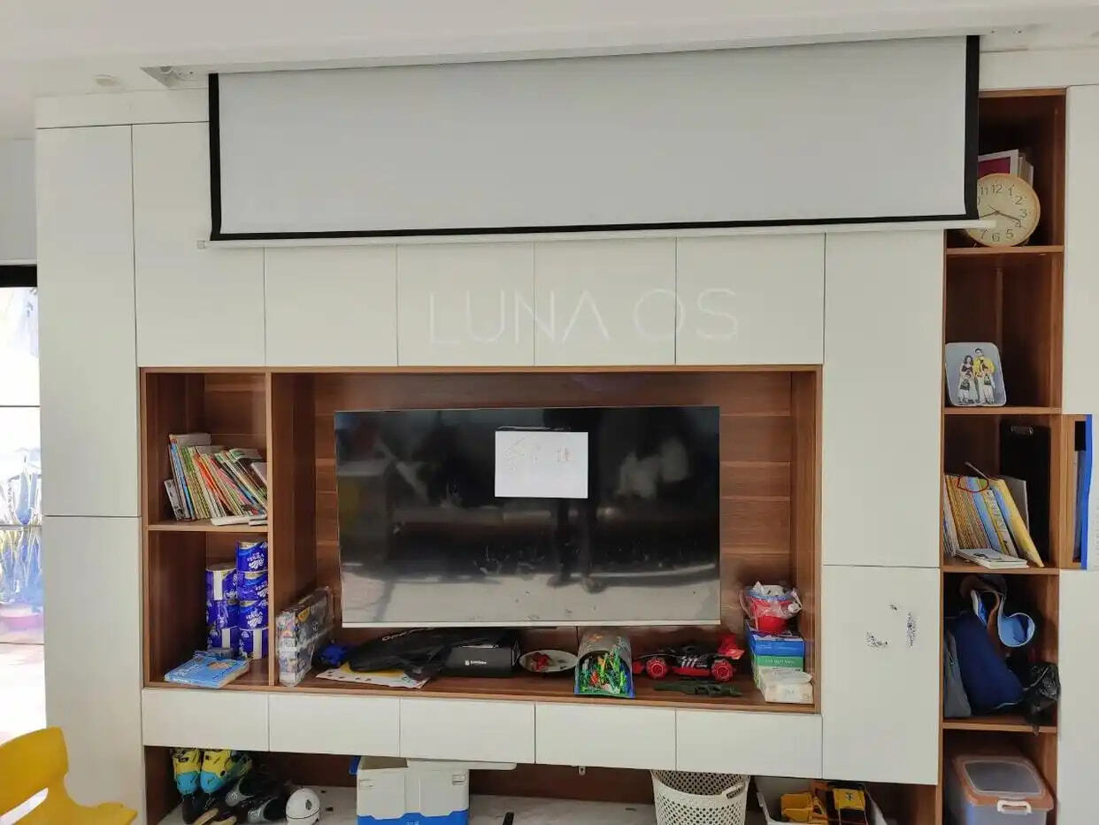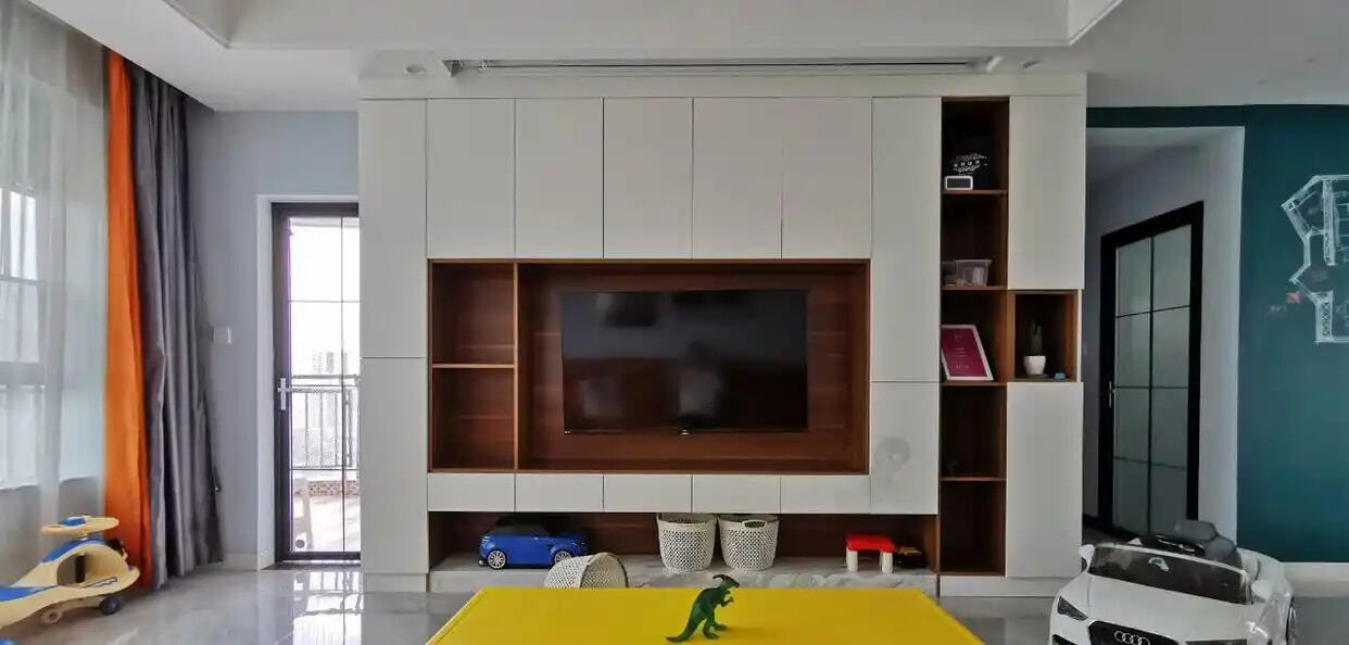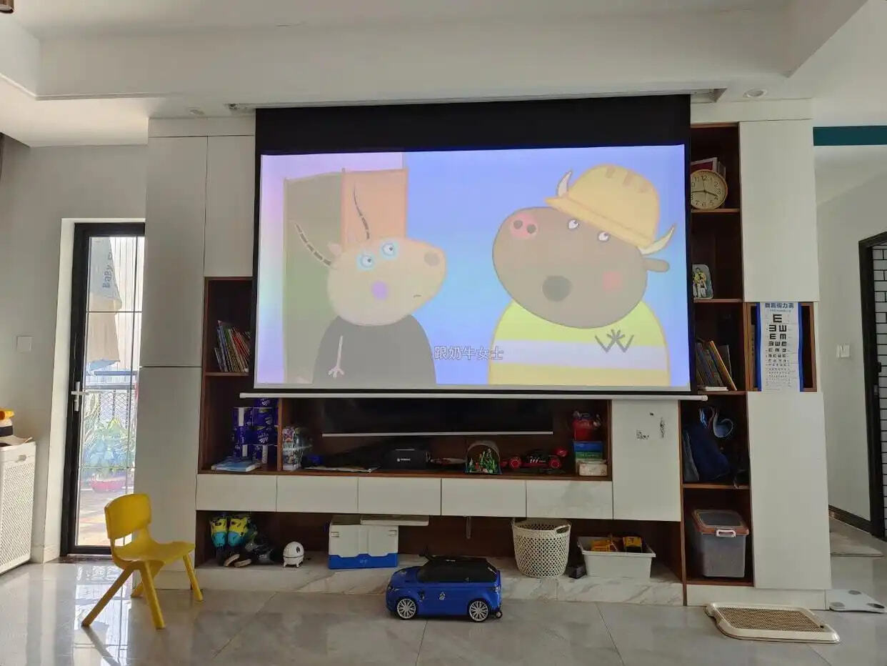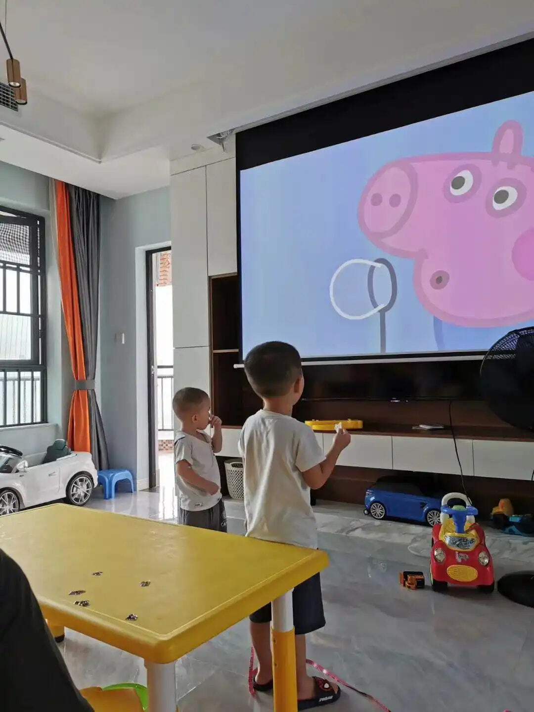 客厅是孩子玩耍的主要空间,电视装在电视墙中间,很容易被孩子“误伤”,我家入住5年,已经坏掉2台电视机了——都是小孩在客厅看电视玩耍时,不小心把玩具砸碎了屏幕;但投影仪5年了还是好好的。
