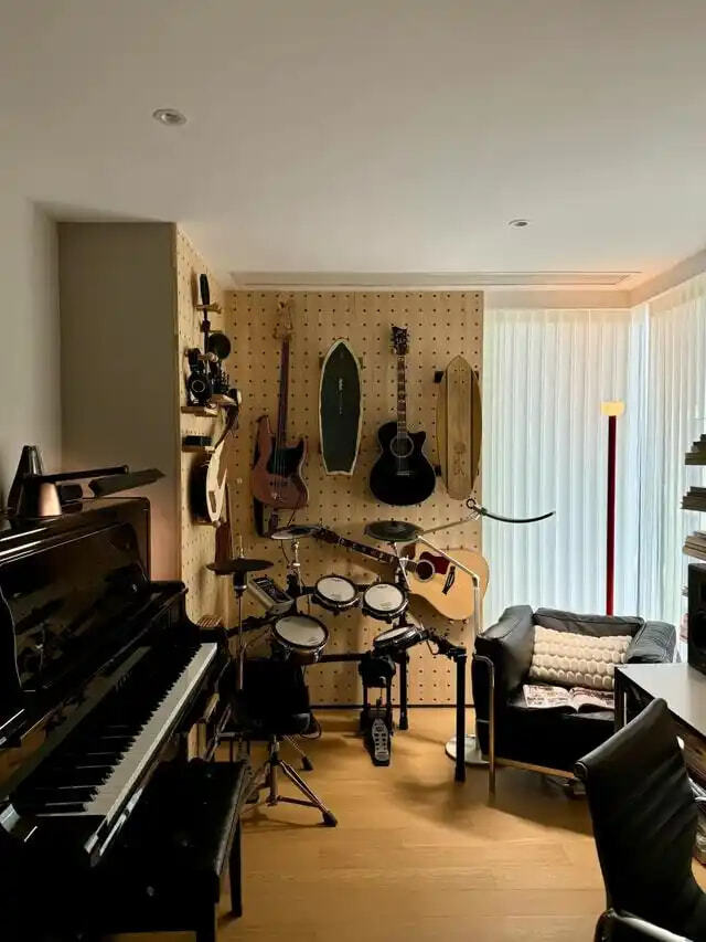 像家里有音乐系的、或是喜欢音乐的,可以把书房改造成乐室,摆上乐器、谱架、音响,进去弹琴、弹吉他、打鼓,练习创作自己的音乐,也是别样的乐趣吧。