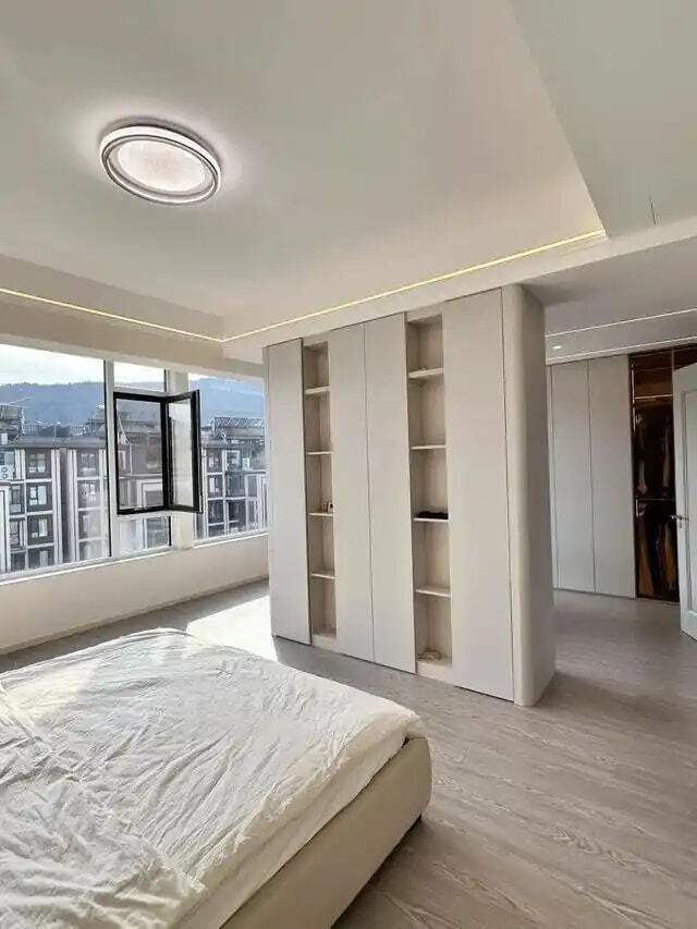 除了与客厅打通,将两间大小卧室进行打通改造,合并为一个大主卧,也能让阳光充分洒入室内,营造出明亮通透的居住氛围,改造后的空间规划合理,配备了独立衣帽间。