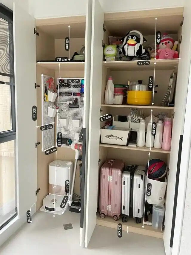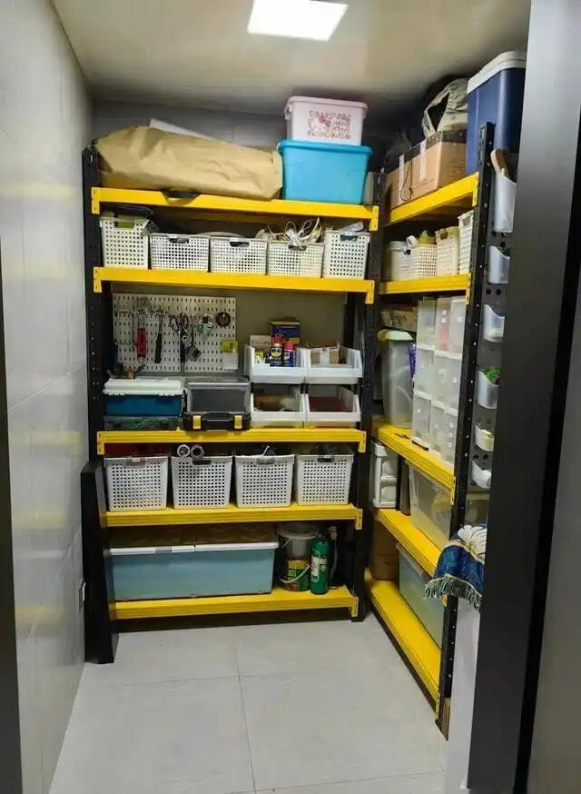 做了个家政杂物间,可以用来放打扫工具、居家备货等杂物的收纳,比如囤的纸巾、洗涤用品,用货架收纳,使用情况也一目了然,用完前能及时补货。