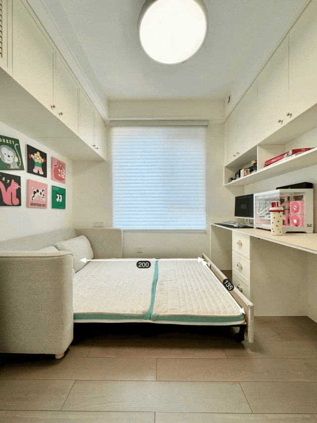 像“看起来没用”的房间,往往是因为他的面积小,做卧室不够用、做书房又不常用,针对这种情况,可以考虑把做成多功能房,比如布置折叠沙发床、摆上书桌,让这个房间可以做客房、又能做书房,平时又很宽敞。