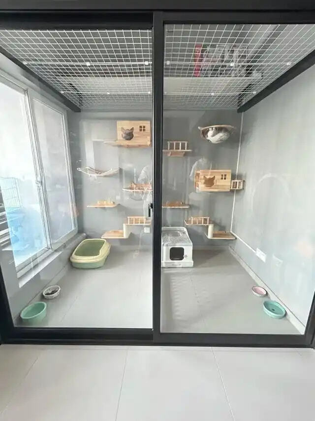 借助玻璃移门,让“毛孩子”住在里面,你忙的时候,它住里面你也可以看到它的活动;你闲暇之余,想要撸猫吸猫的时候,打开移动让它出来互动。