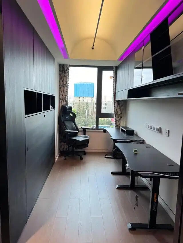 在我的设计生涯中,遇过好几对因游戏结缘的夫妻,他们都是游戏主播/爱好者,直接将一个小次卧打造成属于我们自己的娱乐空间——电竞房,周末一起打打游戏、看看书,对喜欢玩游戏的小两口而言,是简直不要太爽了。
