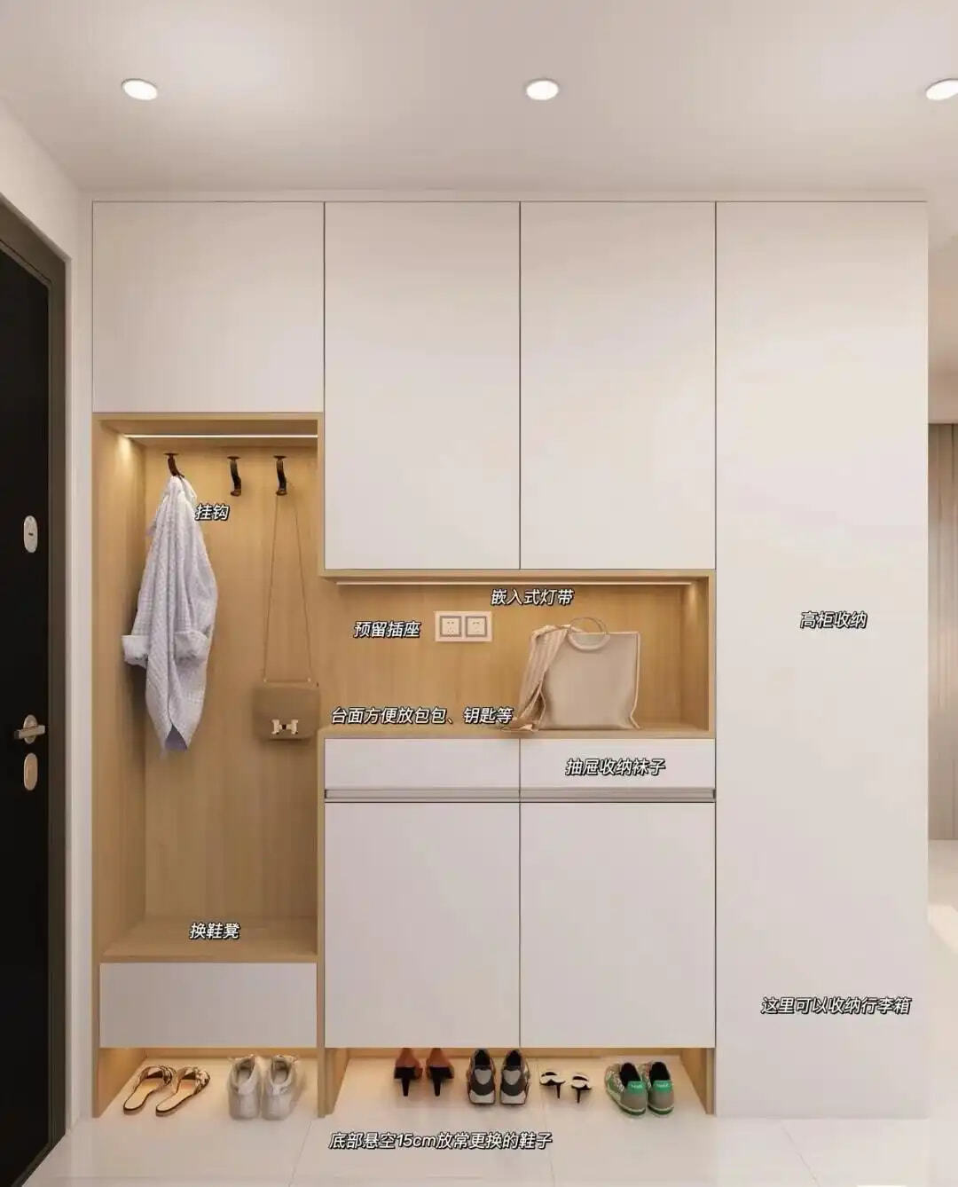 3.鞋柜底部悬空15-20cm,日常换鞋更方便;中部镂空50-60cm,便于放置钥匙、包包等小物件。