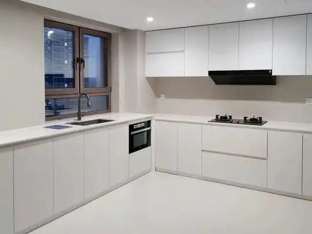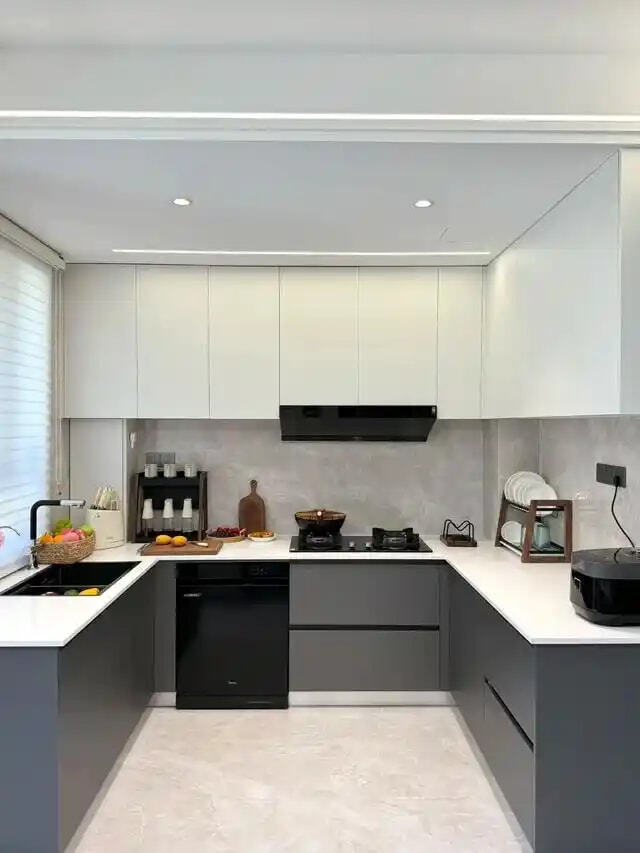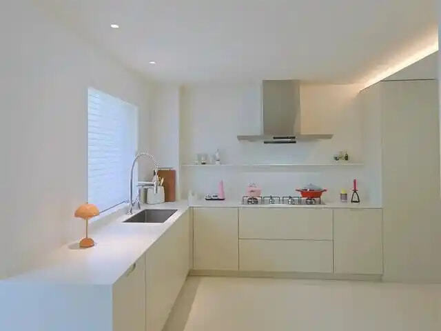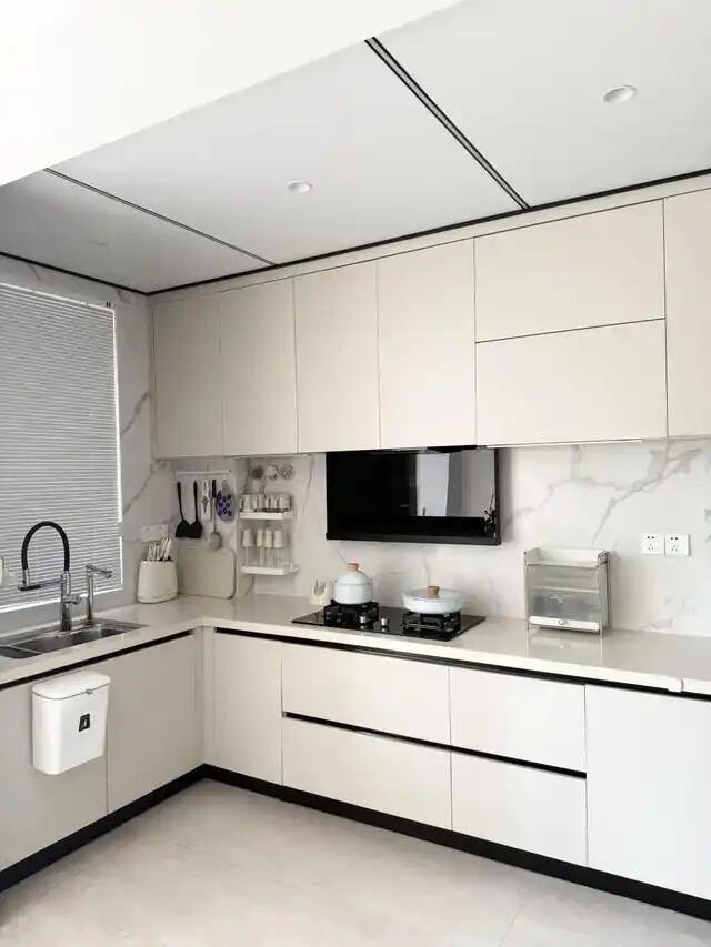 其次,橱柜设计是关键!地柜和吊柜做顶天立地设计,顶部无死角,避免积灰;橱柜选择同色系柜门,采取无拉手设计或隐藏式拉手,保持空间整洁。