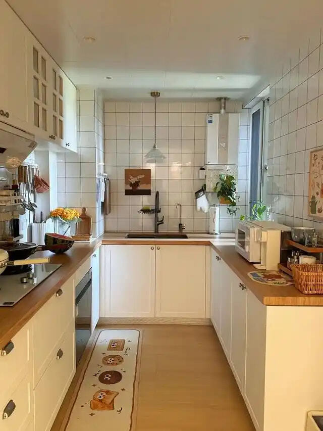 然后,色彩搭配以浅色系为主,比如白色、浅灰、米白等,让厨房显得明亮宽敞;墙面贴瓷砖时选择大规格瓷砖,减少接缝,清洁更方便,视觉也更美观大方。