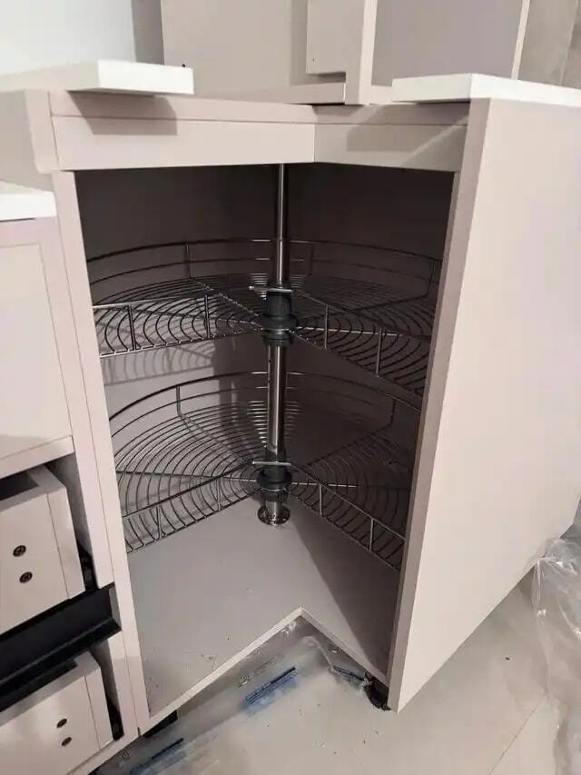 ⑤转角利用:普通设计的橱柜,转角空间利用率极低,还会成为鸡肋甚至卫生死角。通过安装能 360° 转动的旋转拉篮,让深处的调料瓶触手可及。将难以利用的死角变成高效收纳空间。