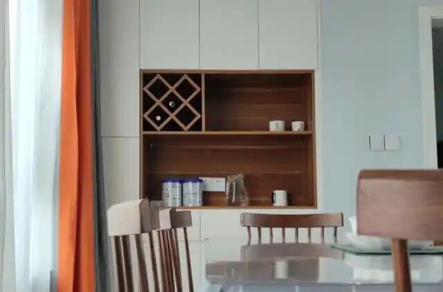 ①餐边柜开放格:餐桌上堆满水杯、纸巾、零食等杂物,吃饭时局促不堪?餐边柜中间或侧面设计部分开放格(藏八露二),放置水壶、杯具、纸巾等,解放餐桌,保持空间整洁美观。