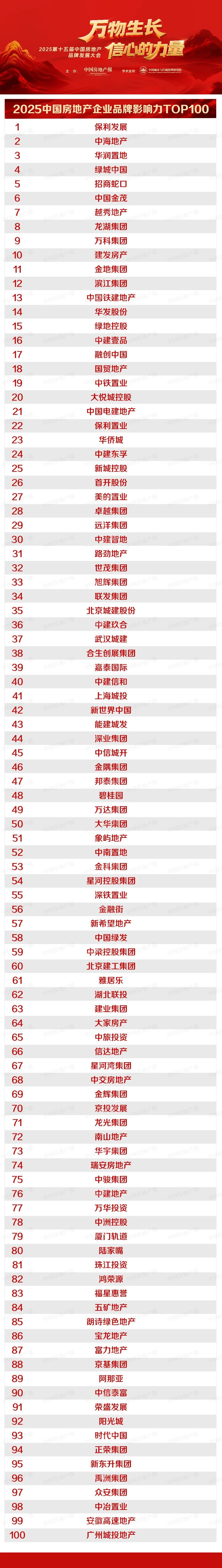 排名在“2025中国房地产企业品牌影响力百强榜”前20位的房企分别是保利发展、中海地产、华润置地、绿城中国、招商蛇口、中国金茂、越秀地产、龙湖集团、万科集团、建发房产、金地集团、滨江集团、中国铁建地产、华发股份、绿地控股、中建壹品、融创中国、国贸地产、中铁置业和大悦城控股。