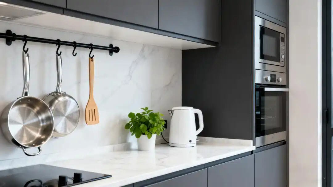 ②向垂直空间要面积:使用墙面置物架、磁吸刀架、系统挂钩等,将常用物品挂起来,解放台面,让常用物品一目了然。