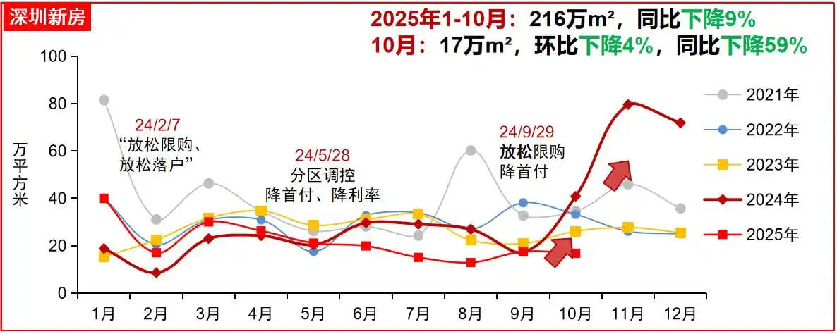 深圳同样呈现下行趋势,10月新房销售面积17万平方米,环比下降4%,同比下降59%。广州则出现环比回升,新房销售面积65万平方米,环比增长11%,同比下降42%。