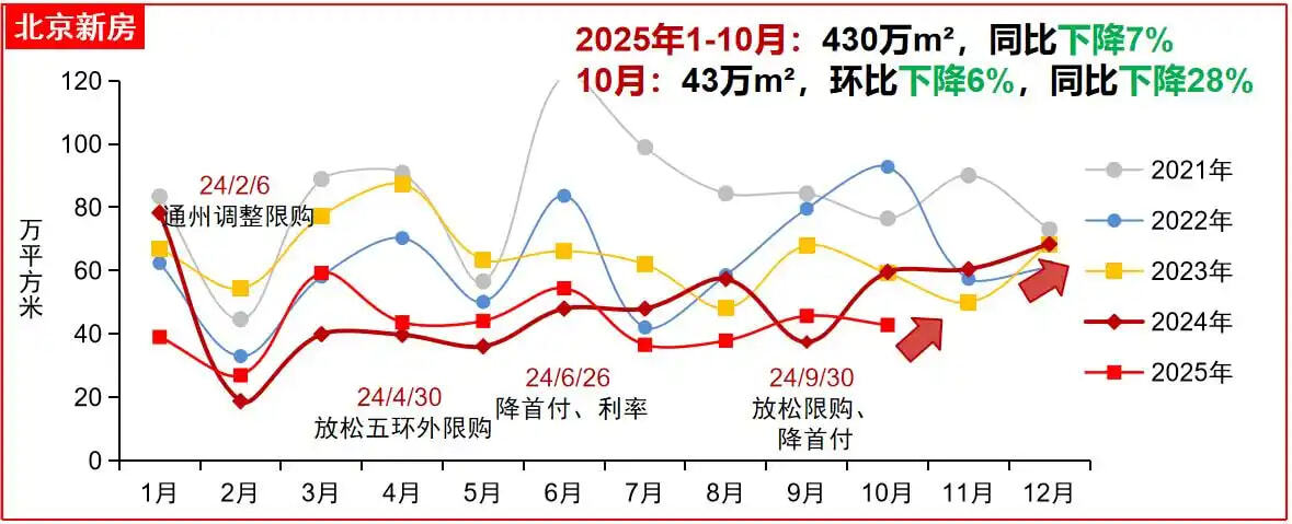 克而瑞统计数据也显示,2025年10月北京新建商品住宅(含普通住宅、别墅,不含共有产权房)成交3194套,环比下跌1.9%,同比下跌22.9%;成交均价为58649元/平方米,环比下跌2.4%,同比上涨3.5%。