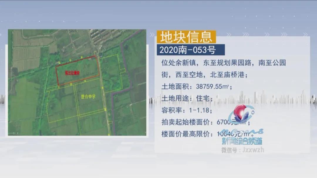 南-053号地块位于余新镇,东至规划果园路,南至公园街,西至空地,北至庙桥港;土地面积:38759.55㎡;土地用途:住宅;容积率:1-1.18;拍卖起始楼面价:6700元/㎡;楼面价最高限价:10040元/㎡。