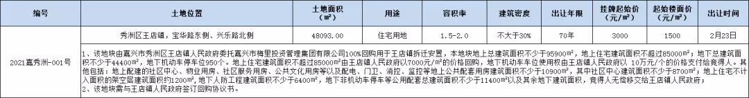 土地面积48093平米,住宅用地,容积率1.5-2.0,建筑密度不大于30%,绿地率不小于30%。 该宗地块挂牌起始价3000元/㎡,起始楼面价1500元/㎡。地块采用“竞价+竞配建”的方式挂牌出让。最高限价7500元/㎡,上限楼面价3750元/㎡。1、该地块由嘉兴市秀洲区王店镇人民政府委托嘉兴市梅里投资管理集团有限公司100%回购用于王店镇拆迁安置,本地块地上总建筑面积不少于95900㎡,地上住宅建筑面积不超过85000㎡;地下总建筑面积不少于44400㎡,地下机动车停车位950个。地上住宅建筑面积不超过85000㎡由王店镇人民政府以7000元/㎡的价格回购,地下机动车车位使用权由王店镇人民政府以 10万元/个的价格支付给竞得人。其他包括:地上配建的社区中心、物业用房、社区服务用房、公共文化用房等以及配电、门卫、消控、监控等地上公共配套用房建筑面积不少于10900㎡,其中社区中心建筑面积不少于8700㎡;地上住宅不计入面积的架空层建筑面积约1200㎡,地下人防工程建筑面积不少于6400㎡,地下非机动车停车等公用配套总建筑面积不少于11400㎡以及其余地下建筑面积,竞得人无偿移交给王店镇人民政府;该宗地块位于王店镇,具体在梅里印象花苑东侧,地块所在片区为王店镇区商品房和拆迁安置房集中开发片区。这个片区也是王店镇区目前重点开发的片区。地块周边配套有梅里小学和王店镇中学,北侧不远有梅北公园。 土地性质上,该宗地块为拆迁安置用地,相当于拿地方是承建方的角色,预计地块定向出让,或者和去年的新塍镇宅地类似,也会有竞价产生。