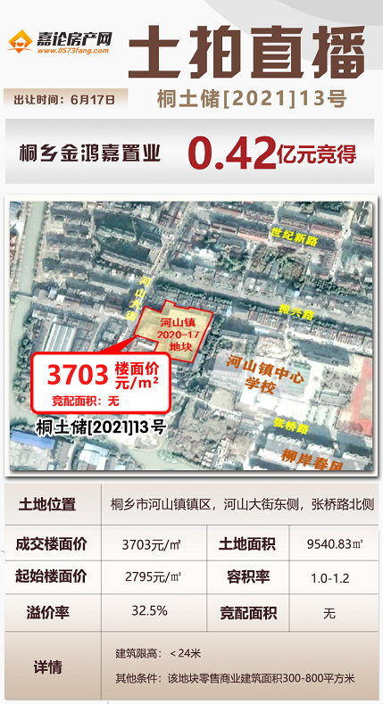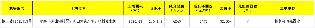 地块编号为桐土储[2021]13号,竞拍20轮,以总价4240万元,溢价32.5%,楼面价3703元/㎡成交,被桐乡金鸿嘉置业摘得。