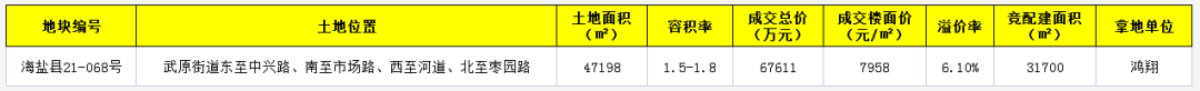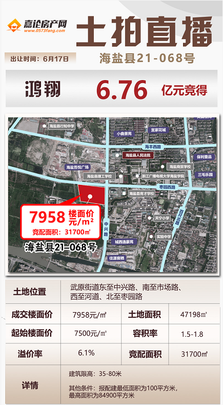 地块编号为海盐县21-068号,竞拍160轮,以总价67611万元,溢价6.1%,熔断楼面价7958元/㎡+竞配建31700㎡成交,被鸿翔摘得,实际楼面价16126元/㎡。