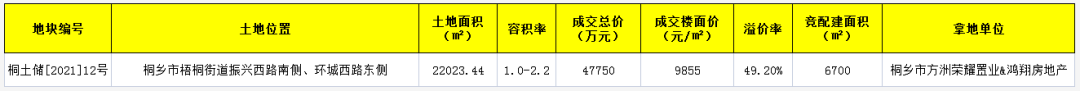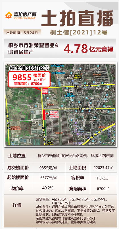 今日(6月24日)嘉兴桐乡出让一宗住宅用地,地块编号为桐土储[2021]12号,竞拍93轮,以总价47750万元,溢价49.2%,熔断楼面价9855元/㎡+竞配建6700㎡成交,被桐乡市方洲荣耀置业&鸿翔房地产摘得。