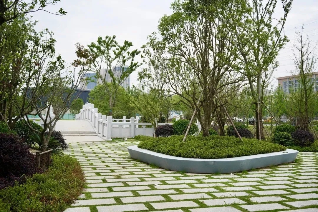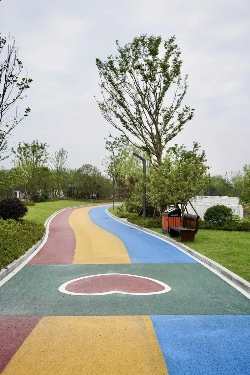 公园铺装材质以自然、生态的溪潭石、植草砖塑胶为主;景观小品与周围环境相互衬托,渲染气氛;以乔、灌、草相结合的植物配置方式,在景观上注重色彩的搭配。
